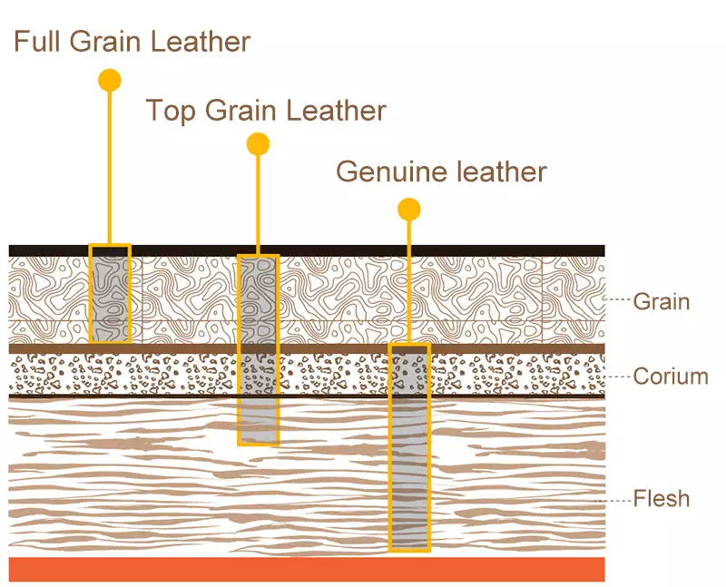 From the image, cowhide can be broadly divided into the outer ‘grain’ and the inner 'corium'. This gives us our first division into full/top grain leather and split leather, which is made from fibrous corium. We also can say full/top grain leather is the first layer of cowhide leather.