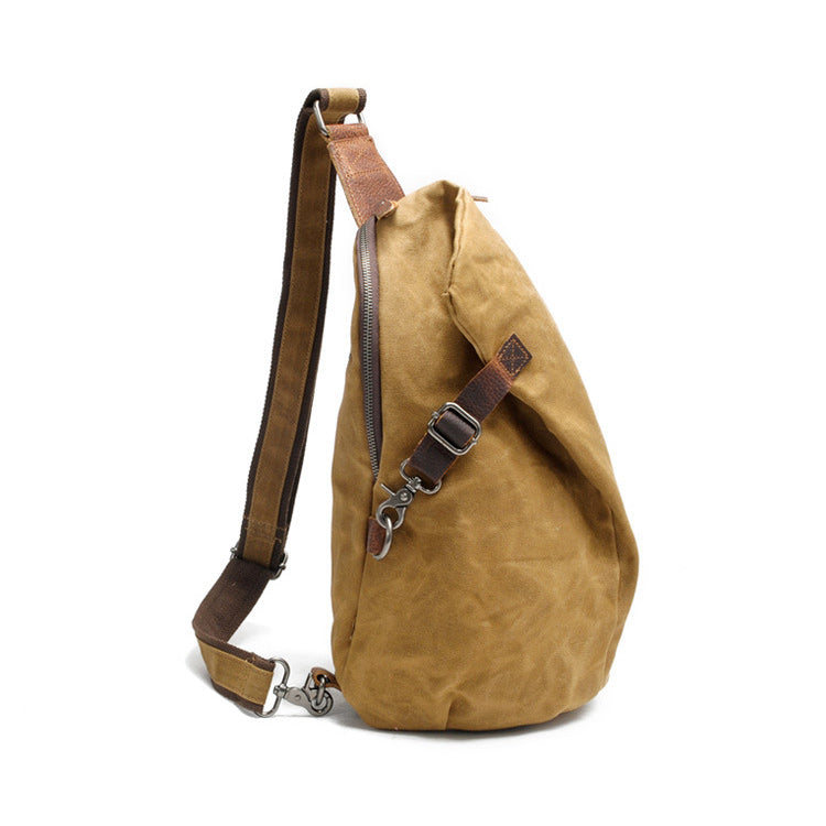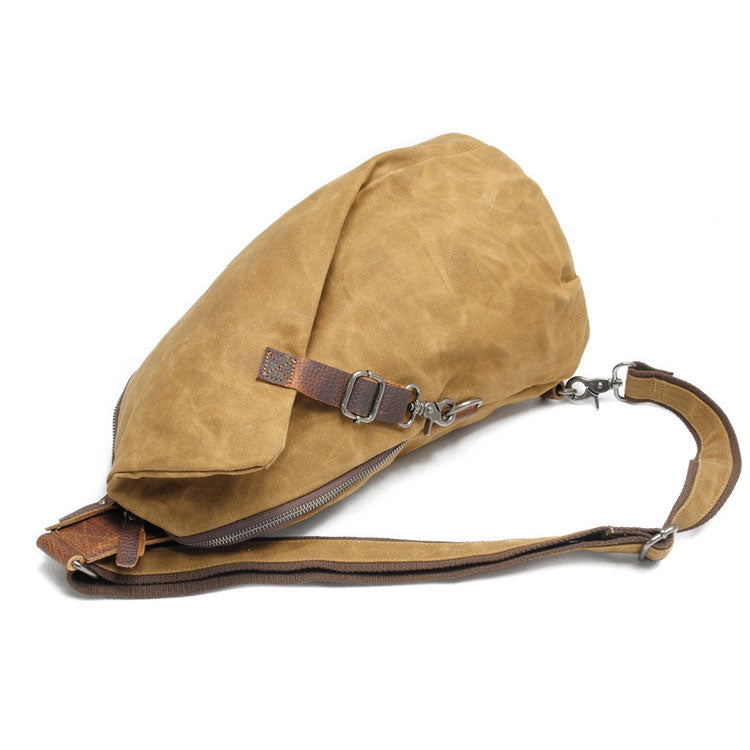 This sling bag is made of waxed canvas, the canvas is heavier and more susceptible to abrasions than the synthetics, but unlike synthetics, its weatherproofing is usually obtained by wax, which can be re-proofed, ensuring continual water resistance and durability.