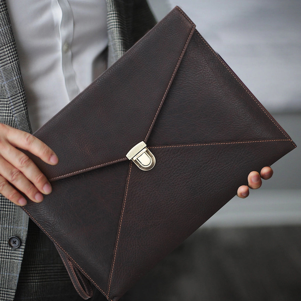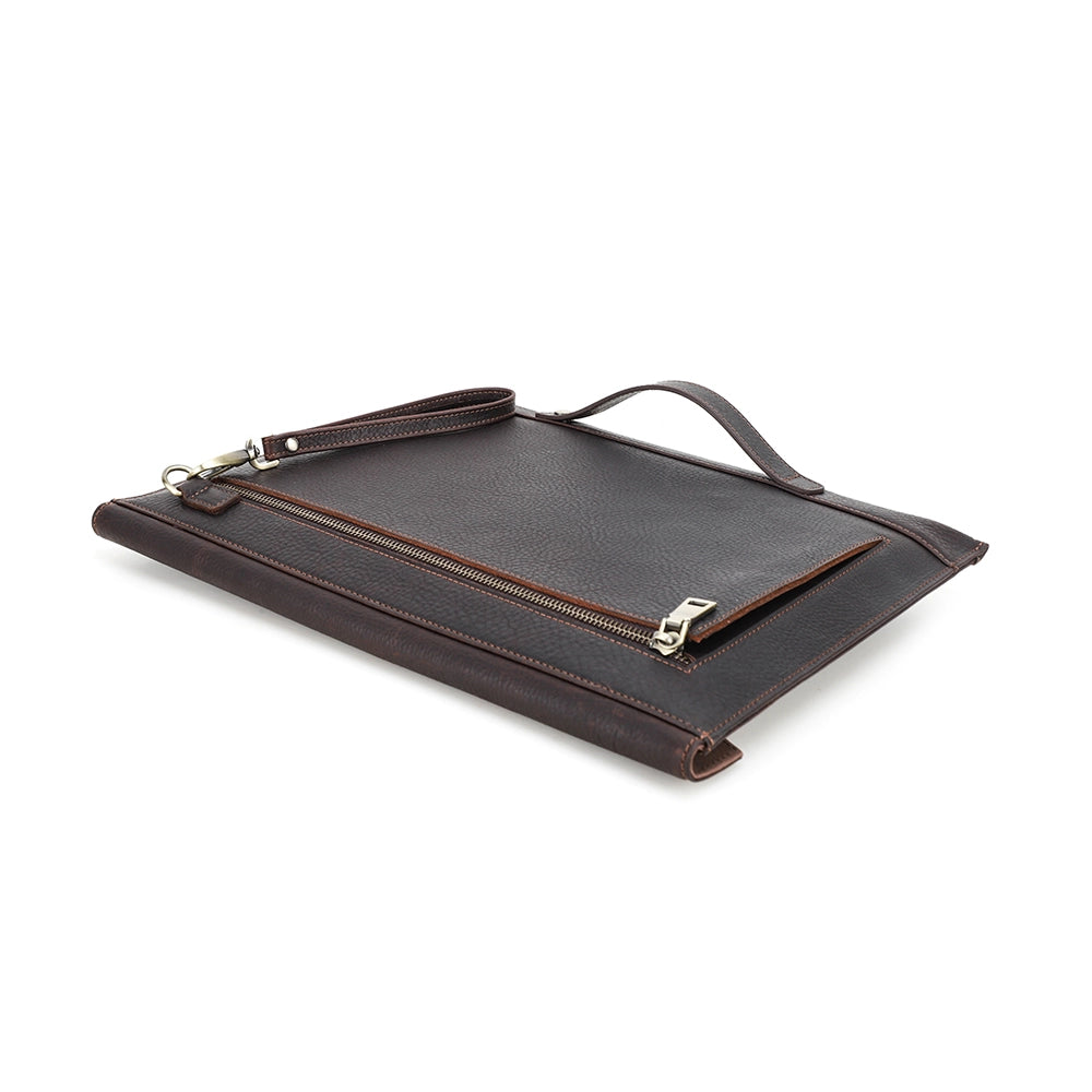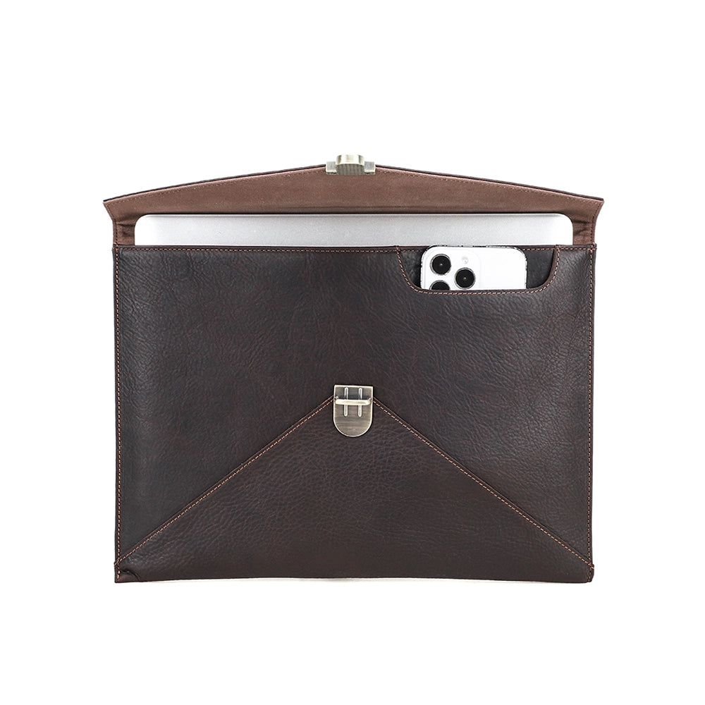 Inspired by a sleek envelope silhouette, this leather laptop sleeve offers a slim, structured profile with a padded main compartment that fits up to a 14.2" MacBook Pro. Thoughtful external pockets keep your phone and essentials organized, while a removable wrist strap and bottom handle provide versatile carrying options—perfect for professionals on the go.