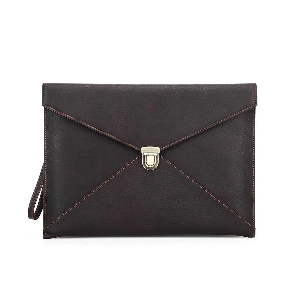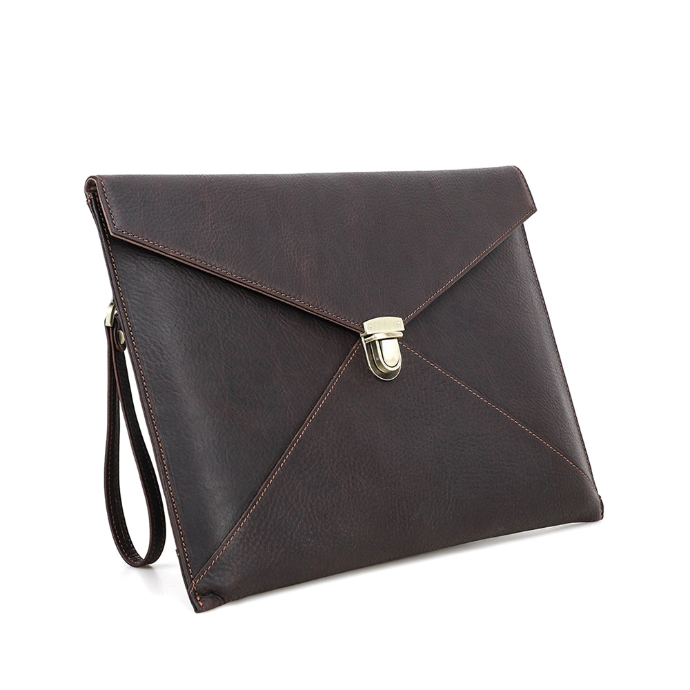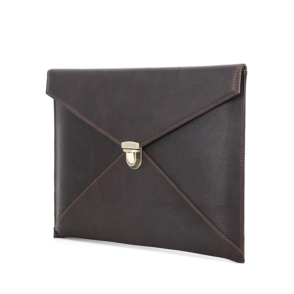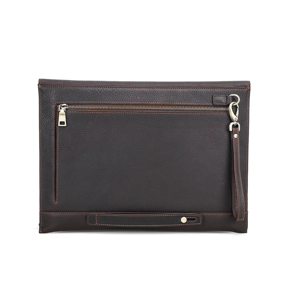 Inspired by a sleek envelope silhouette, this leather laptop sleeve offers a slim, structured profile with a padded main compartment that fits up to a 14.2" MacBook Pro. Thoughtful external pockets keep your phone and essentials organized, while a removable wrist strap and bottom handle provide versatile carrying options—perfect for professionals on the go.