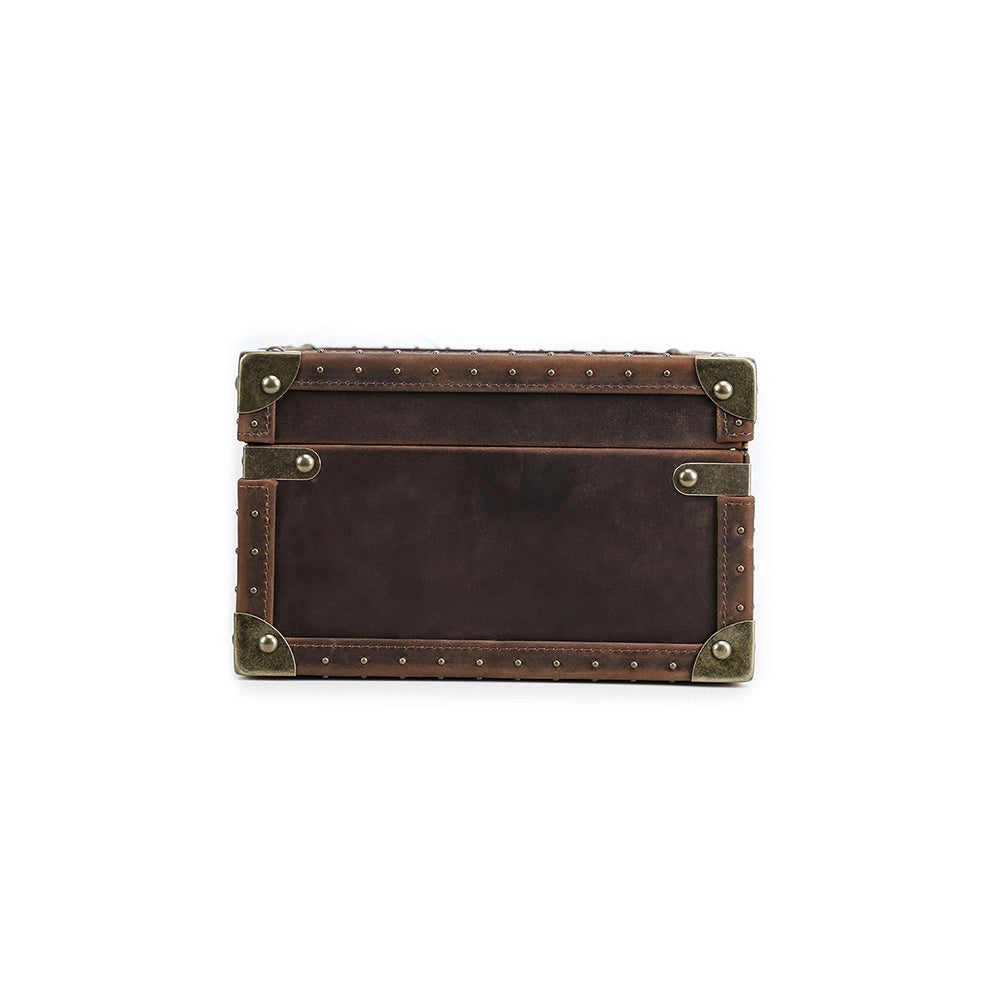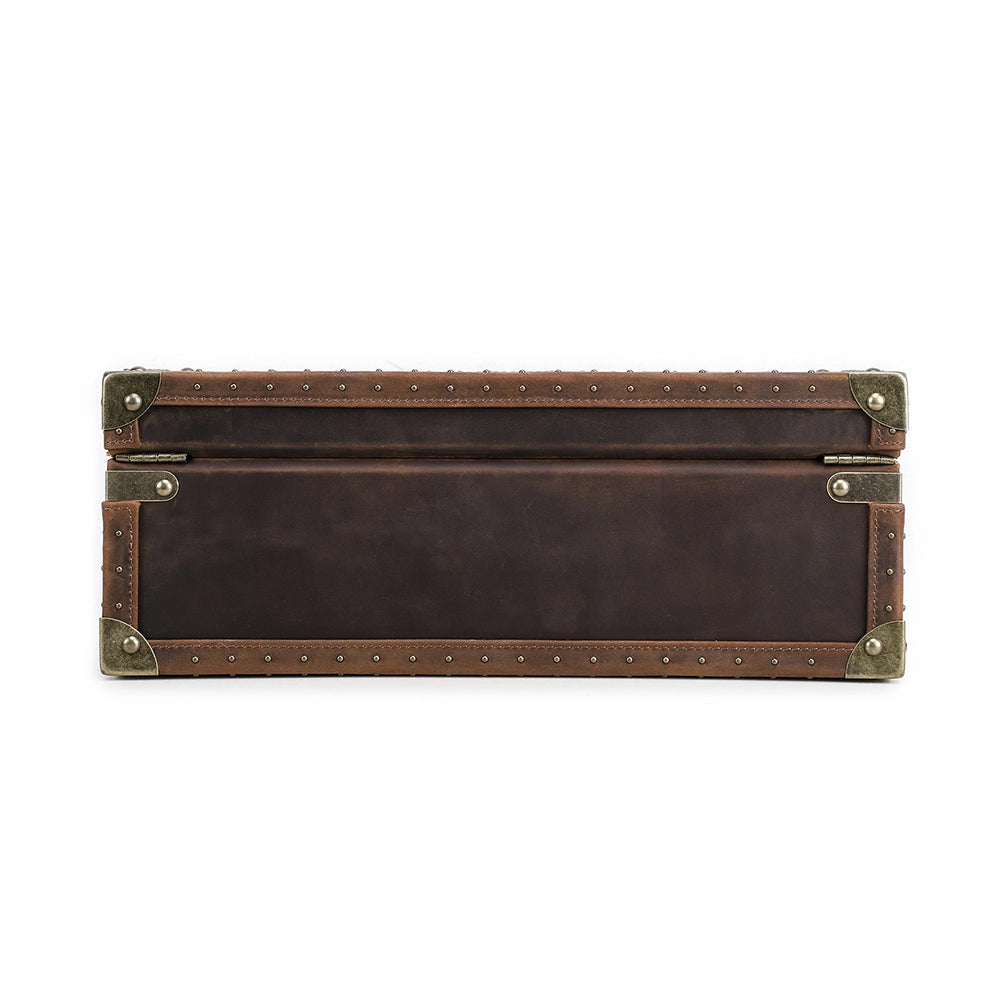 The exterior features a distinctive trunk-style silhouette, crafted from rich, full-grain crazy horse leather that develops a beautiful patina with time and use. Each corner is reinforced with antique brass riveted caps, evoking the rugged elegance of early 20th-century steamer trunks. Â